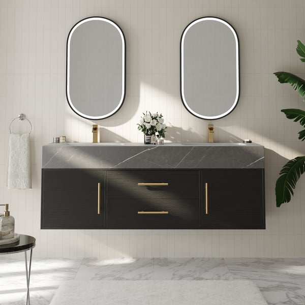 1500mm Black Double Sink Bathroom Vanity with Brushed Gold Handles, Floating Design