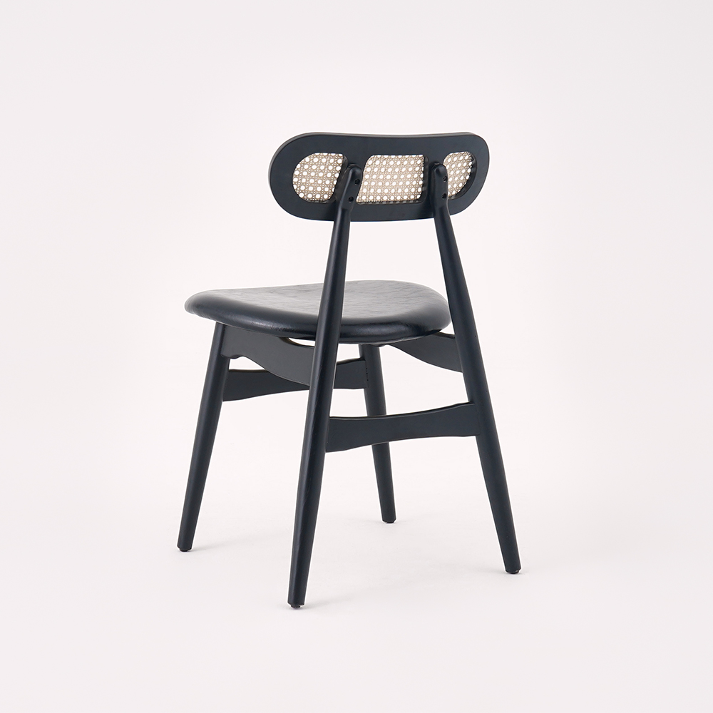 Japandi Rattan Leather Dining Chair with Ash Wood and Faux Leather in Black Finish