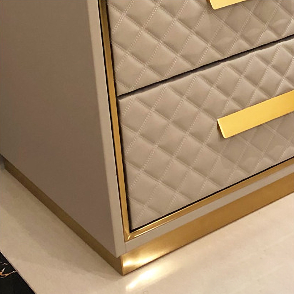 Add a sense of luxurious style to your home with the beautiful and functional 2-drawer nightstand. Featuring a sharp silhouette with diamond pattern tufted detail and strip handles, it is truly the icon of modern style. Coming with a rectangular surface, it allows you heartily to display your table lamp, alarm clock and frame photos. While the pull-out drawers create enough space to place things within reach while you are on a voyage of deep sleep. Constructed of premium materials, including beech, PU leather and stainless steel, this wonderful nightstand has been ready to up your bedroom for years to come. - Materials: Beech, PU Leather, Stainless Steel- Colour: White- Overall Dimensions: 21.7"L x 17.7"W x 20.1"H (550mmL x 450mmW x 510mmH)- Number of Drawers: 2- Assembly Required: Yes/p>